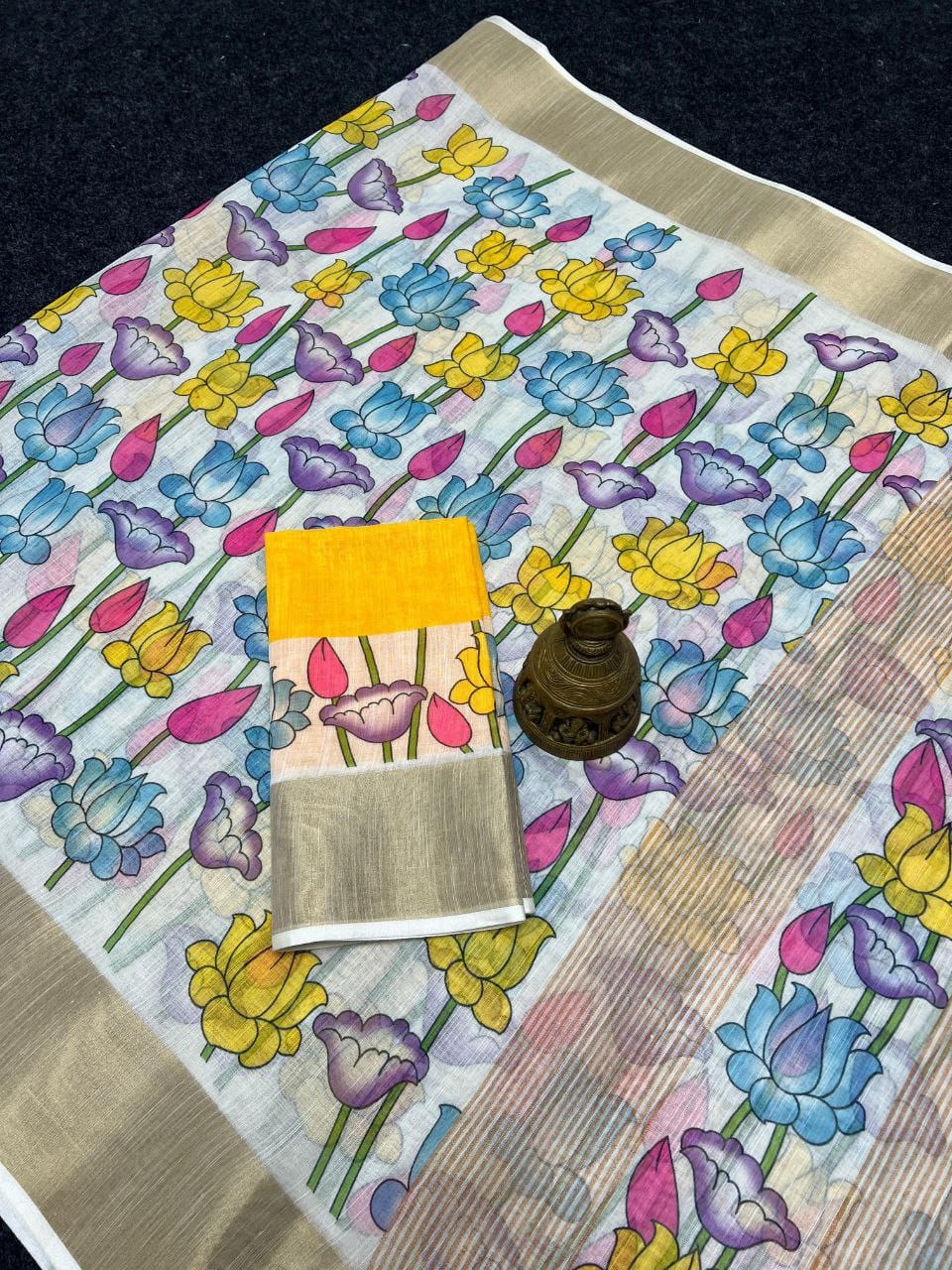 Multi Color Plain Mix Linen Cotton Saree With Digital Printed Work
